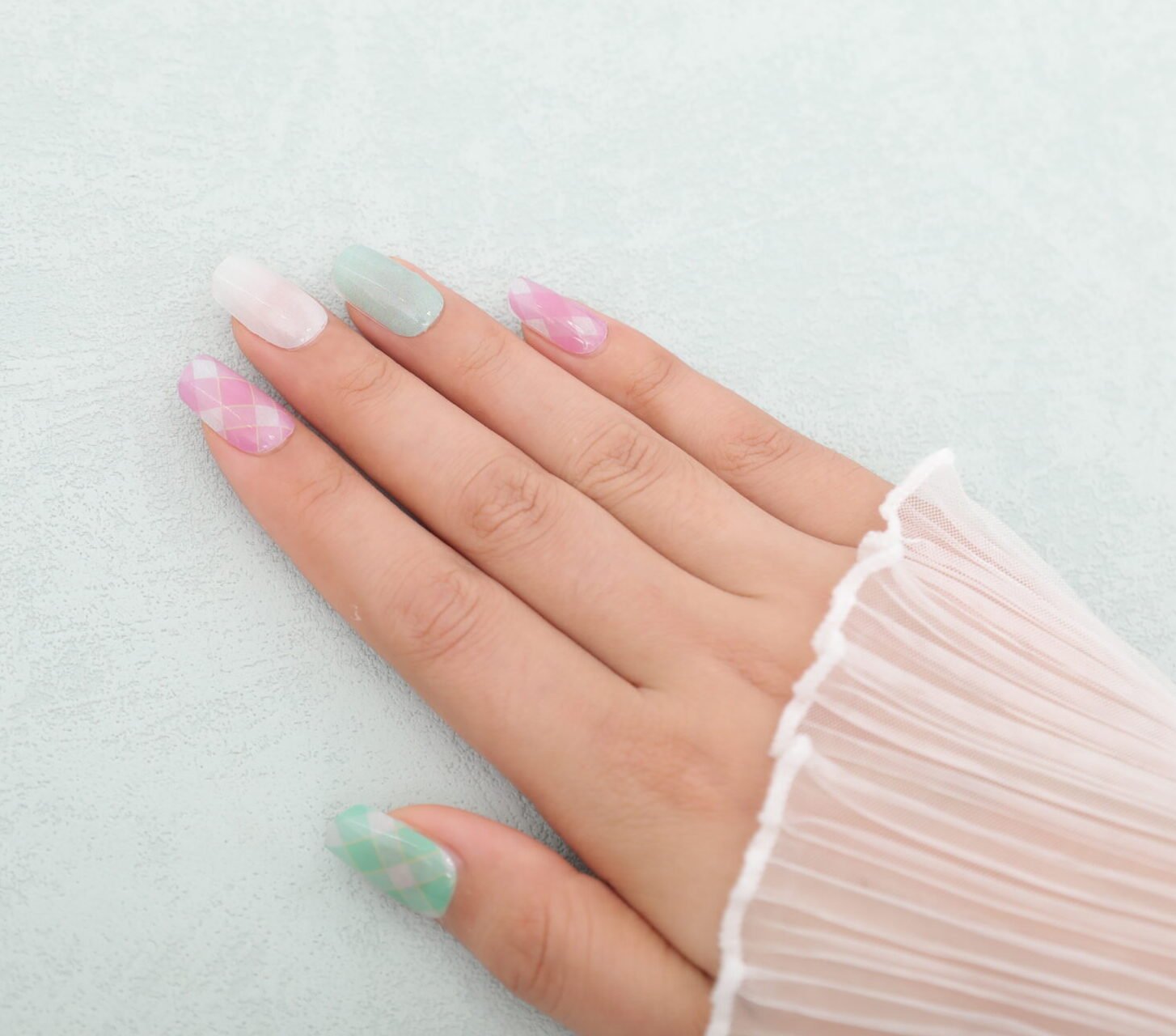 • Pattern Design: The nail sticker showcases a delicate diamond-shaped patchwork pattern, with a striking contrast between pink and green, adding interest and vibrancy to the ensemble.