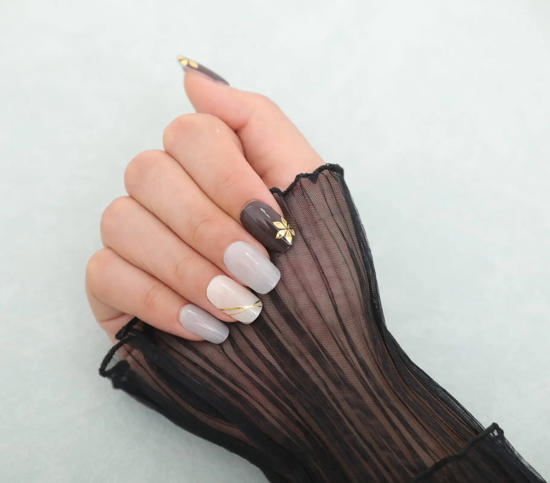 • Graphic design: The manicure is decorated with delicate gold dots and lines for a luxurious feel. The simple and detailed design makes the overall shape more elegant.